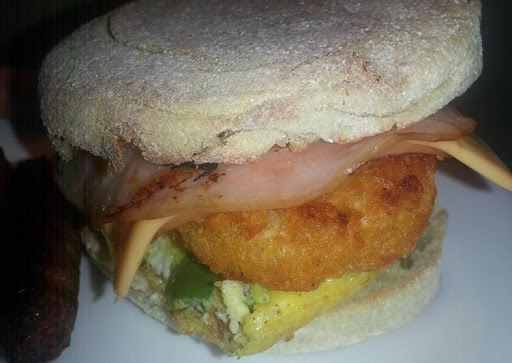 - Stack everything on muffin with the cheese in between the 2 freshly cooked ham so it'll melt nicely. Enjoy!.