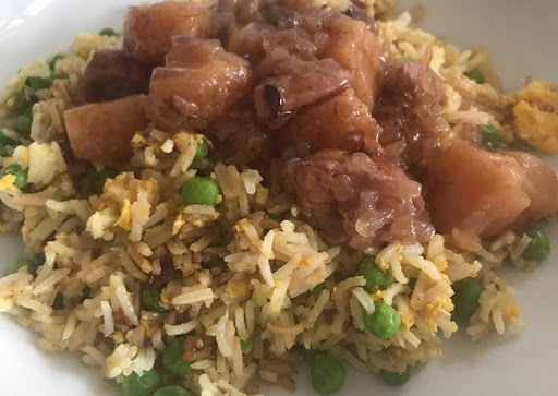 - Make hole in middle and pour in two beaten eggs. Gradually scramble and mix with rice.