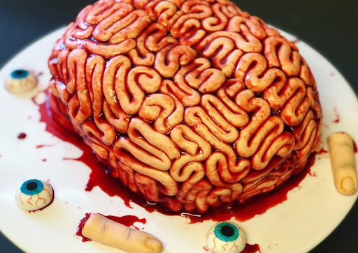 - Roll out sausages of the fondant and use those to create the brain all over the sponge. then spoon over lots of edible blood!.