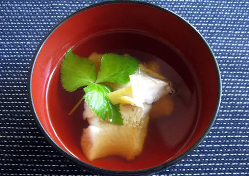 - Serve in a soup bowl, add additional ingredients for flavour and fragrance. Today I added Mitsuba and Yuzu Rind. Slice off Yuzu Rind very thinly, cut into a small rectangle, make two cuts, then twist into a triangle shape..