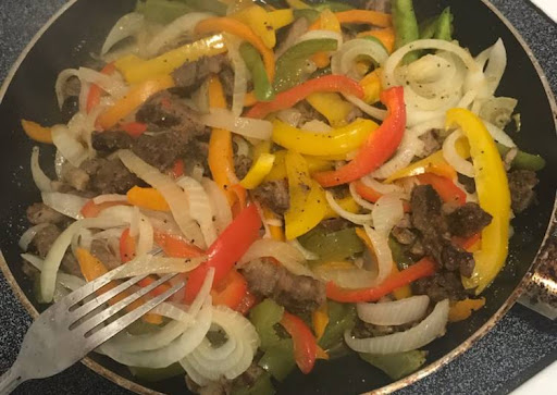 - Cut the peppers thinly sliced and cook steak strips thinly cut onion up add all the ingredients together and let cook for 5 to 7 mins stirring constantly add seasoning and continue cooking at least another 5-7 mins then use a flour tortilla and roll up and with chips and dip or avocado dip.