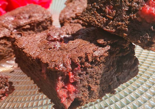 - Fold the flour and chocolate powder and add raspberries and mix gently. Spoon mixture in baking tray and bake for 25-30min until just firm. Remove and cool in the tray..
